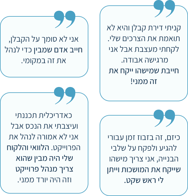 במהלך ניהול הפרוייקט אני מוודא שהקבלן וכל הספקים עובדים לפי התוכניות,